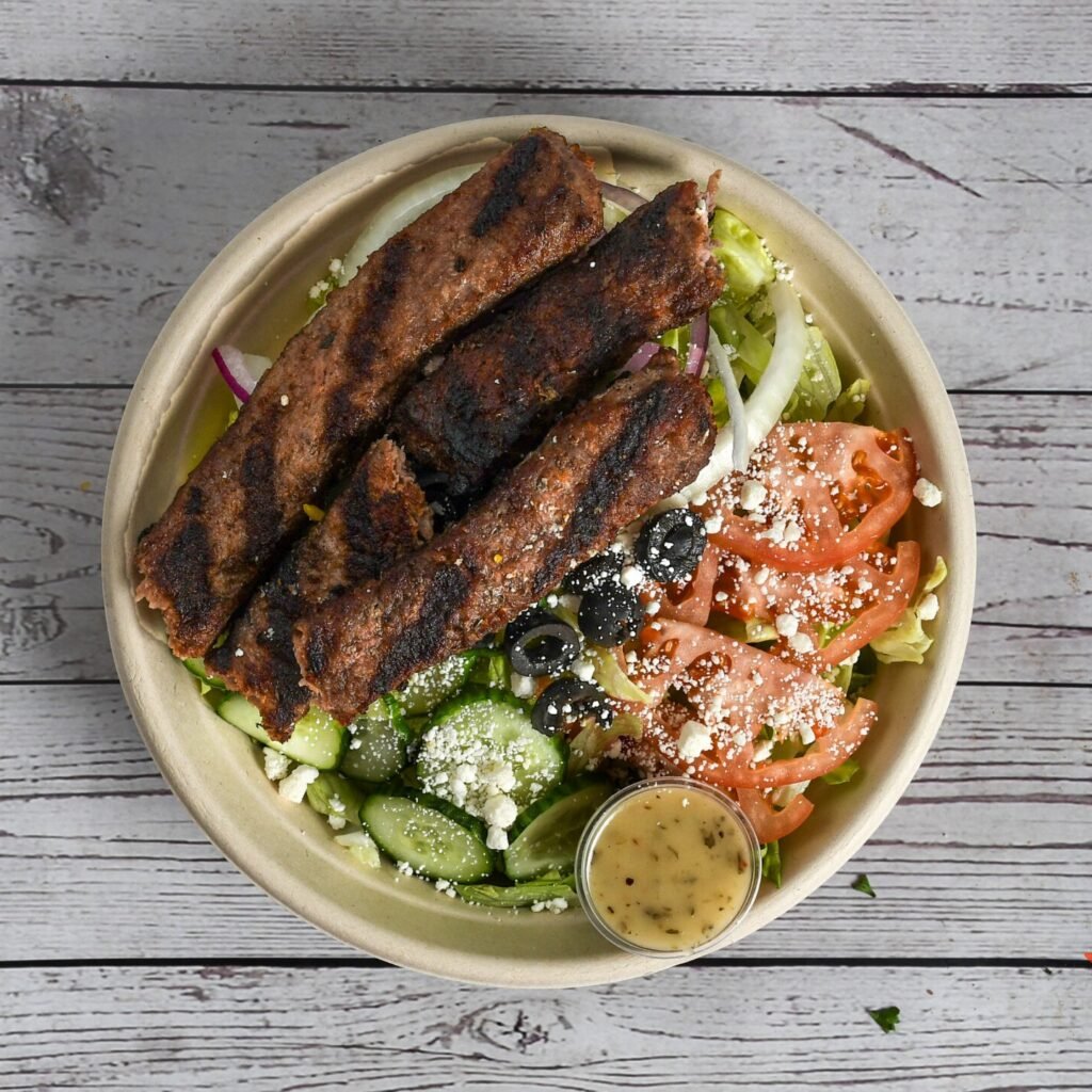 Juicy, marinated beef kabobs grilled to perfection and served over a bed of crisp fresh salad and your choice of sauces to make light yet satisfying Mediterranean meal.